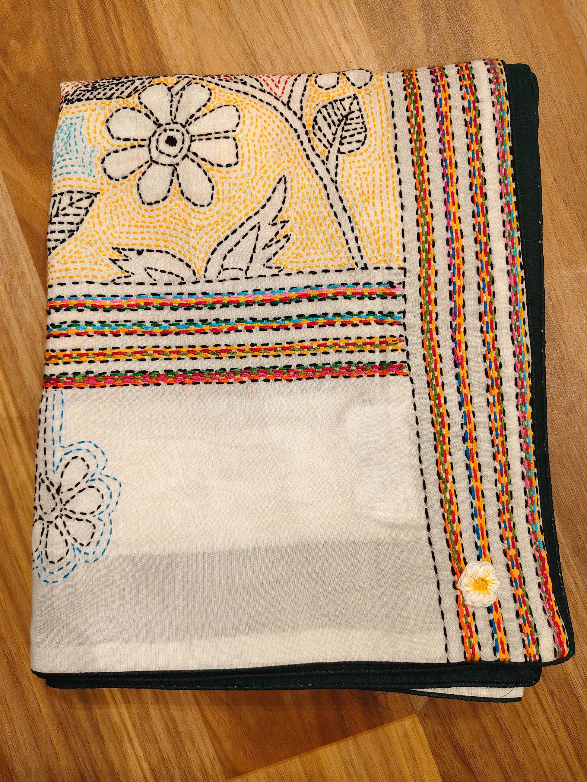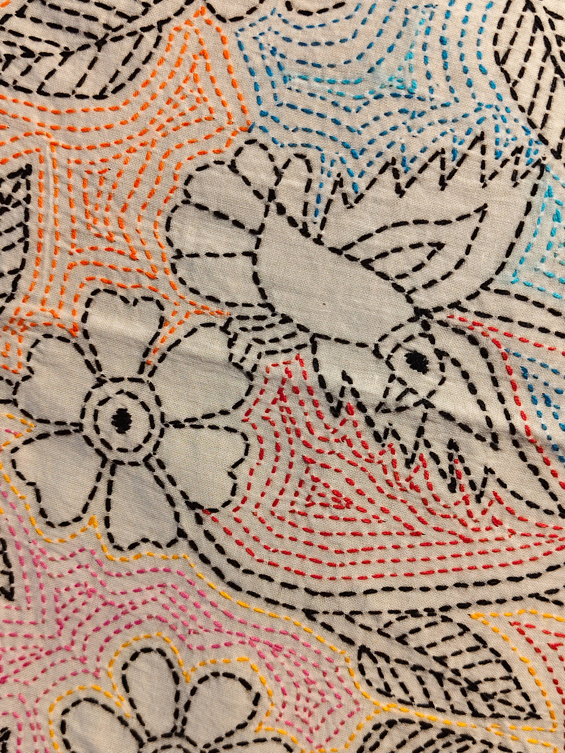 - About Kantha:- Kantha involves layered cotton stitched with continuous running embroidery to reinforce and embellish. Its micro-stitch repetition builds structural density and surface relief. Originating in Bengal, it demonstrates efficient upcycling through stitch-based reinforcement and narrative patterning.