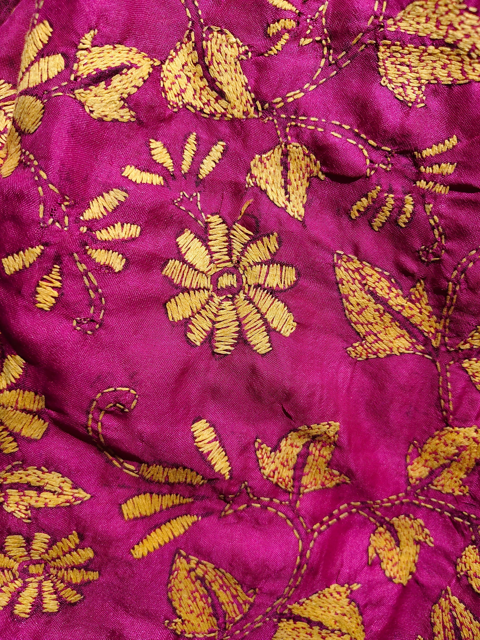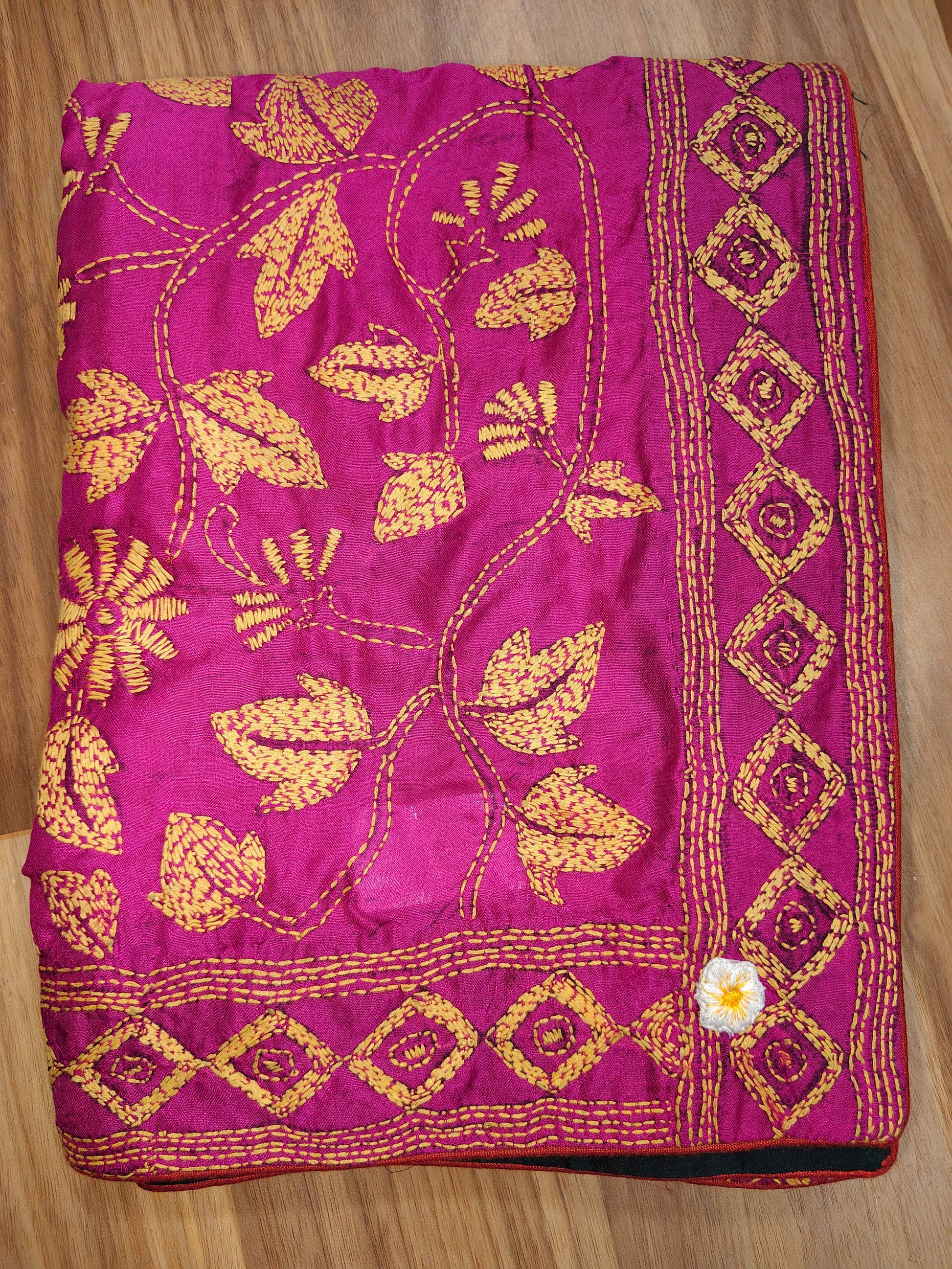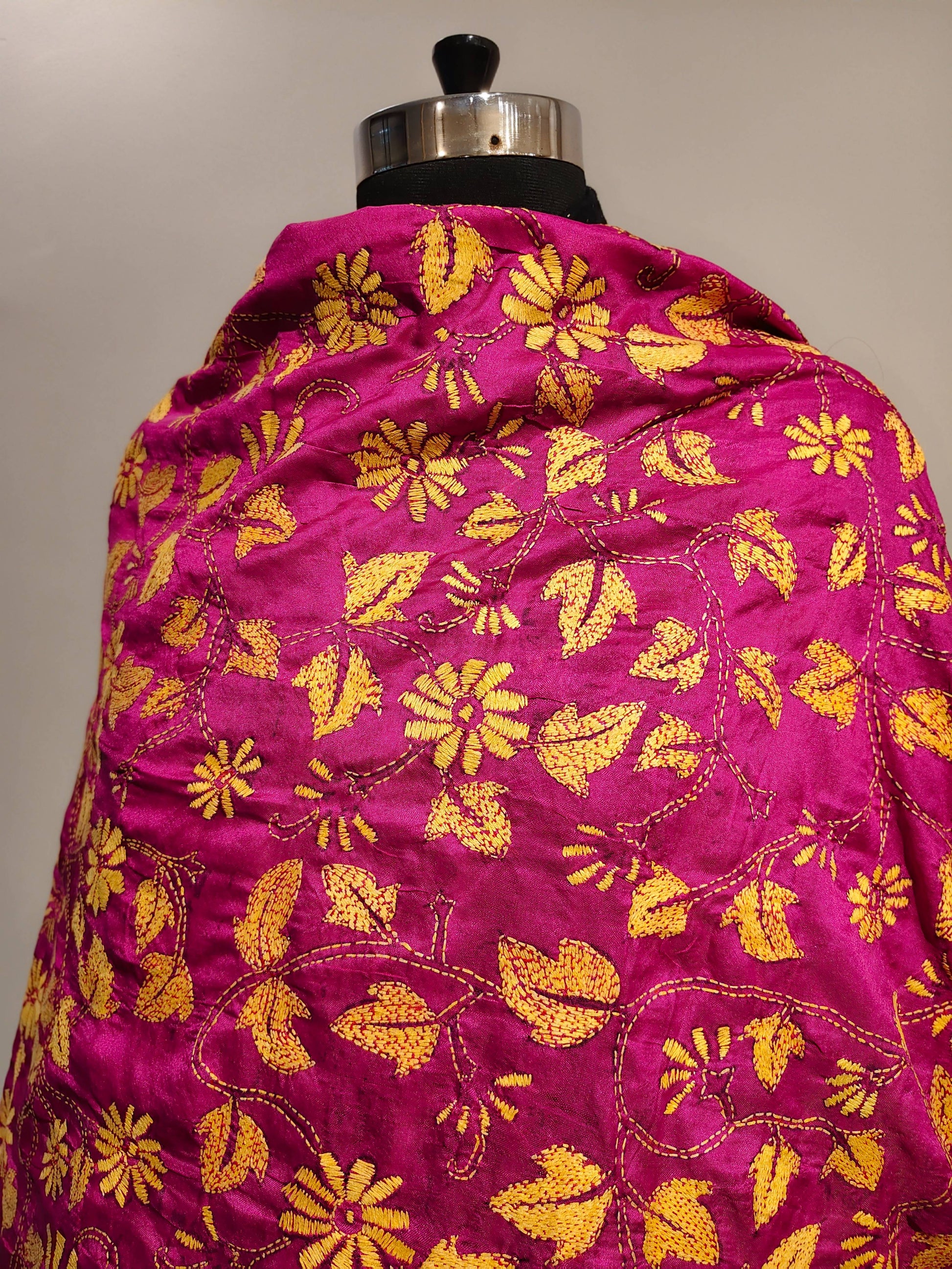 On this magenta silk dupatta, Kantha embroidery flows in measured rhythm, connecting the tactile with the visual. The shimmer of silk beneath layered threadwork lends a quiet sophistication to every fold.