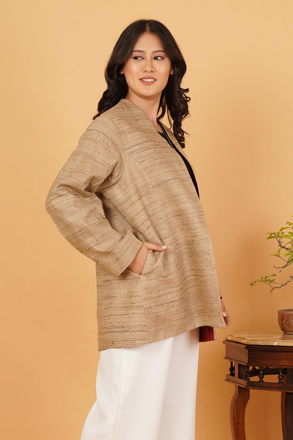 Rich tussar silk merges with soft wool in this reversible multicolour jacket. Its long silhouette is a celebration of warmth, tradition, and artisanal mastery.