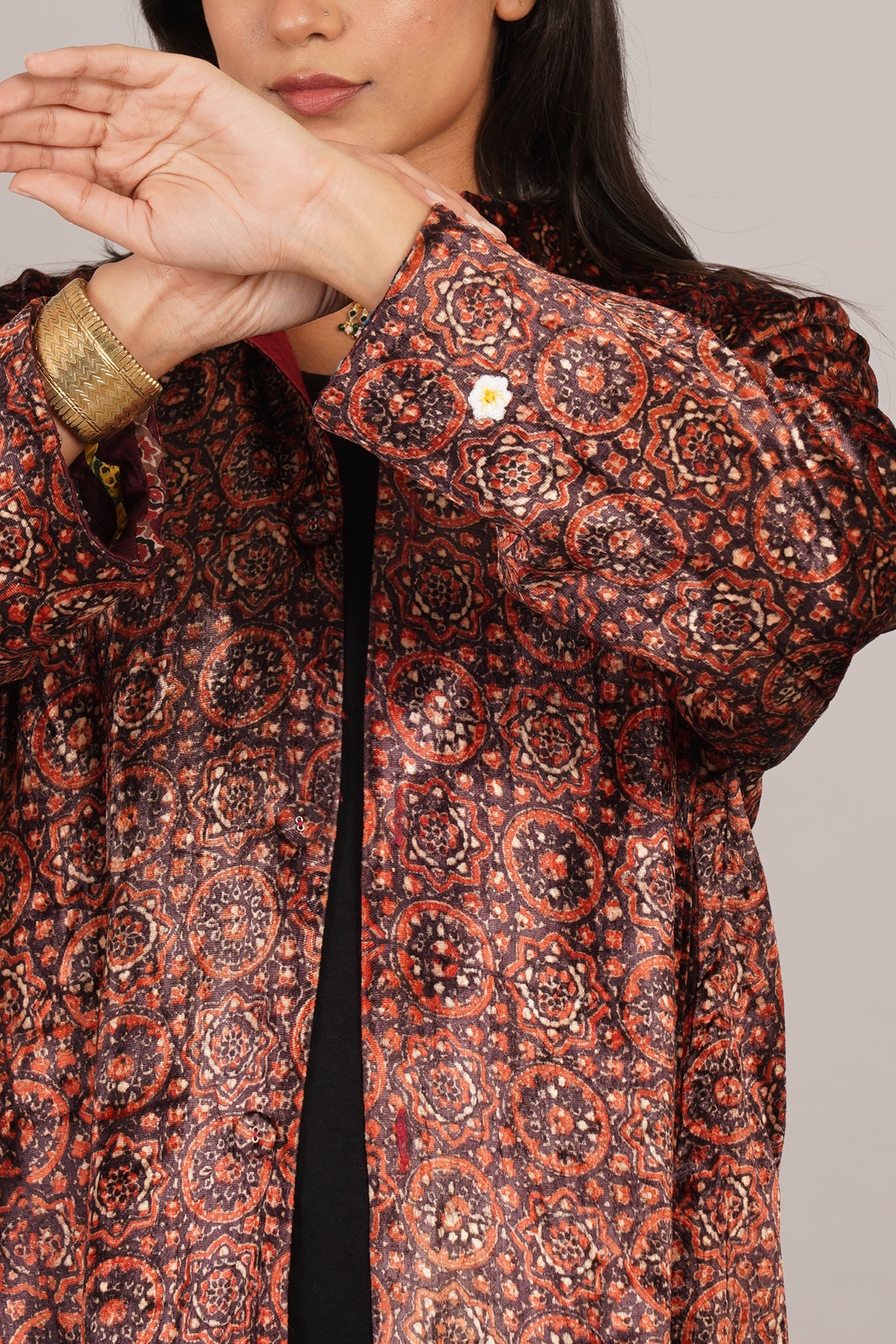 A velvet silk jacket that brings together plush texture and the raw elegance of wild silk. The velvet is woven in layered cloth and cut to form a soft, upright pile with a rich surface depth. Tussar silk panels introduce natural irregularities drawn from wild cocoons and forest habitats. The fabric absorbs colour beautifully, creating subtle shifts in tone and light. Its brown and radish palette adds warmth and understated drama to winter dressing.